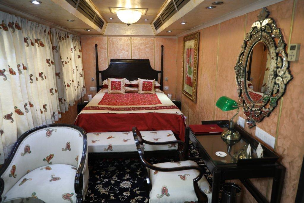 The Palace on Wheels has 13 carriages with Deluxe Cabins and there are three cabins in each carriage. Additionally there is one carriage with 2 rooms (Super Deluxe Cabins). Khidmatgars (personal attendants) will be at hand to provide you with any assistance required and fix any beverages you need.